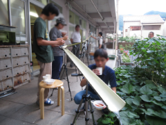 高梁市立松山高校の夏の名物「ソーメンプロジェクト」を7月15日(火)に行いました! 今年も購買前に竹を組んで流しそうめんを設置し、回転式そうめん器も登場。生徒たちは次々と流れるそうめんをキャッチしながら、笑顔いっぱいに楽しみました。また、かき氷やわたがしも用意され、夏ならではの涼しさと甘さを味わえるひとときに。準備では、そうめんをゆでたり台を組み立てたりと、生徒と教員が力を合わせて取り組みました。当日もみんなで協力し合い、笑顔と笑い声があふれる時間に。松山高校ならではの夏の思い出がまたひとつ増えました。
